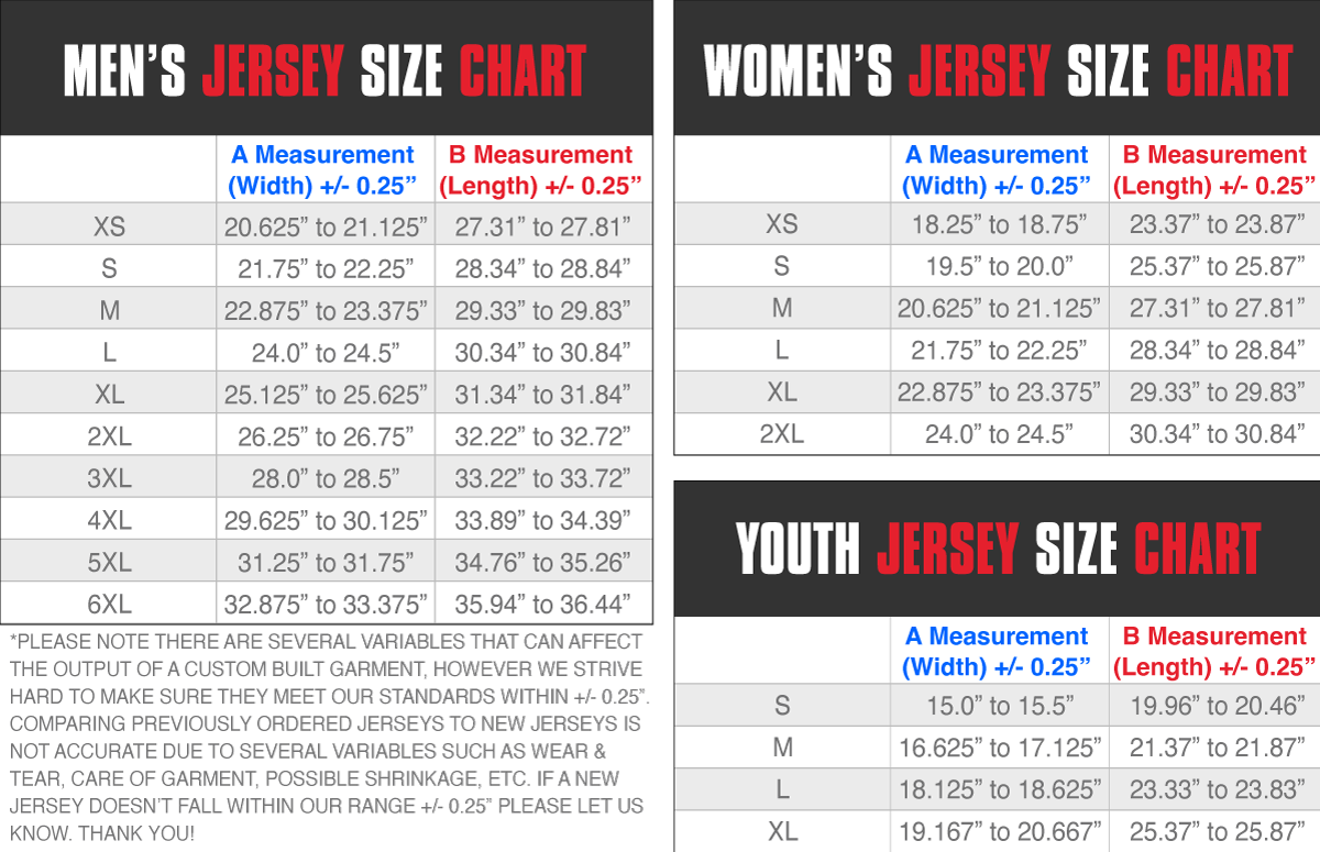 We make every effort to match your colors to your specifications; however, colors on your jersey may not match exactly the colors on your computer screen when you view our proofs. This is because all devices are different, and the screens display color differently than printed fabric. Also, we do not guarantee that colors on reorders will be exactly like your previous orders. We will get as close as possible, but small differences are common. For all jerseys to match, all must be ordered at the same time.RUSH ORDERS